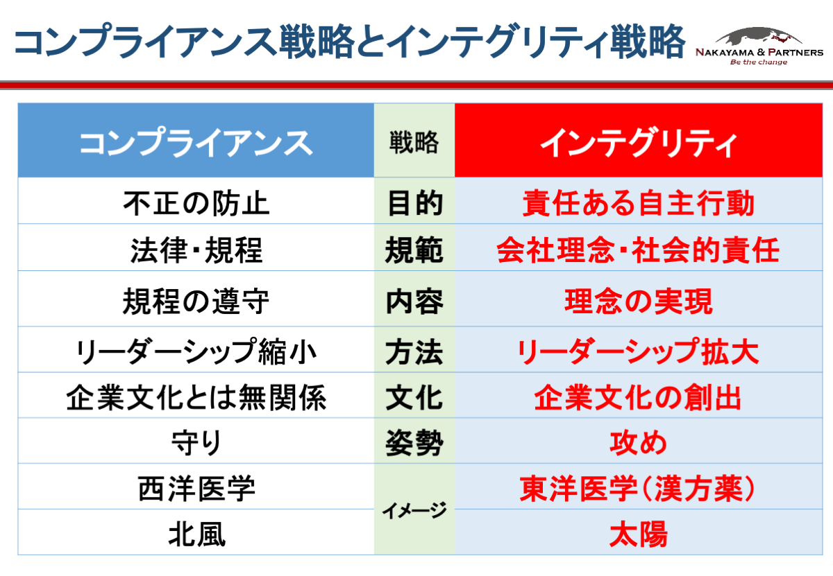 一方,②インテグリティ戦略は,従業員の一体化と組織目標へのコミットを目的とする「太陽」型であり,「攻め」といえます。この戦略は,価値志向(Value-oriented)型や価値共有型とも呼ばれ,企業理念実現の過程の中に漢方薬のように企業倫理維持を織り込むため,「東洋医学的」です。